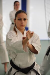 Celeste, in veste di allenatrice, guida le lezione dei piccoli del Dojo e gli accompagna nelle varie gare regionale facendo loro da coach.